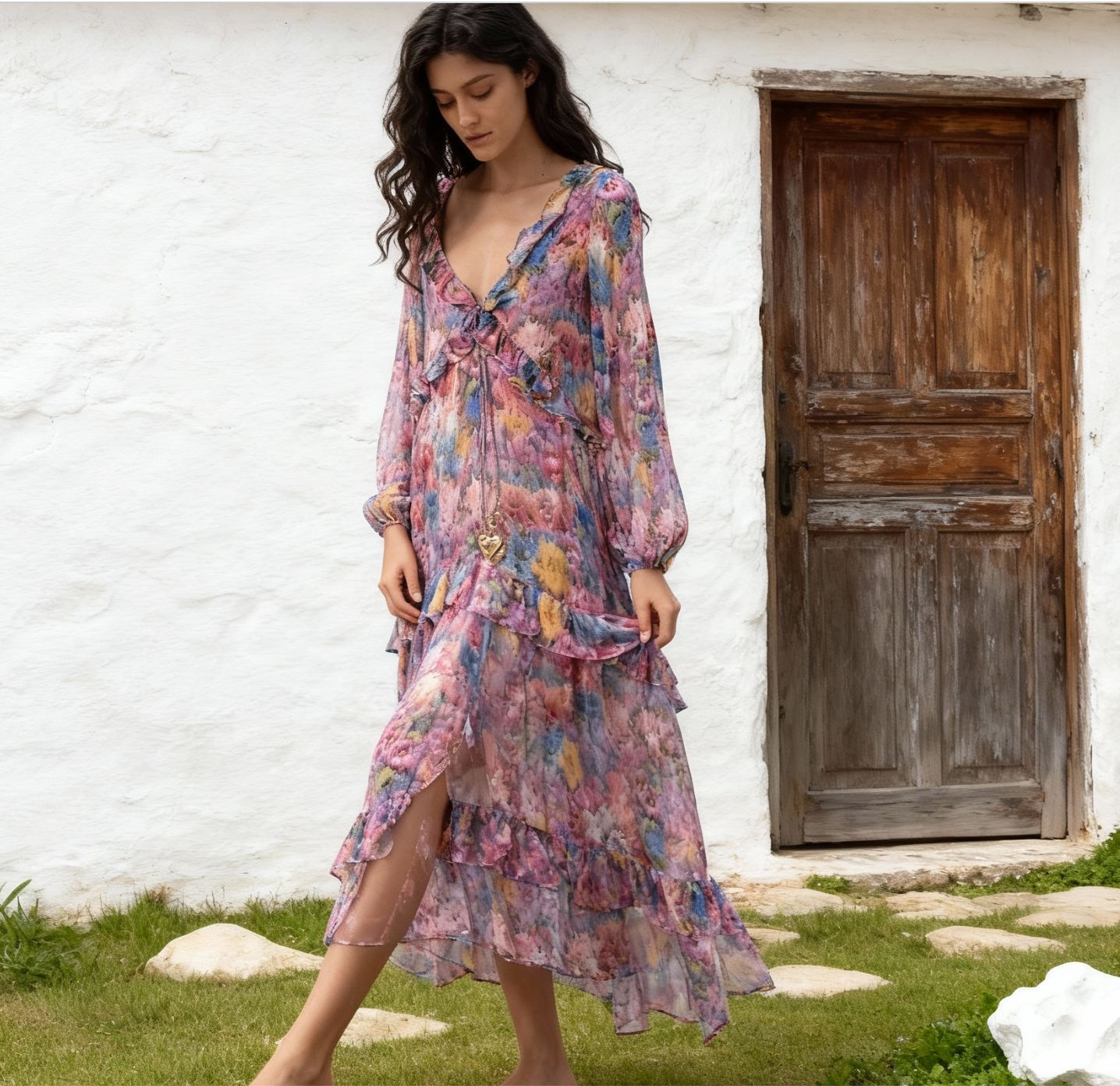 long georgette dress whith soft ruffle detailing,finished whit hand-embroidered ties and refined gold accessories