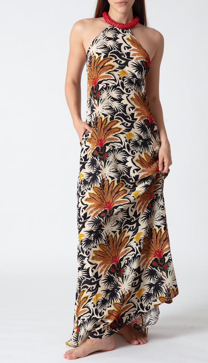 Long dress with an open back, featuring a Desert print in warm cognac tones.