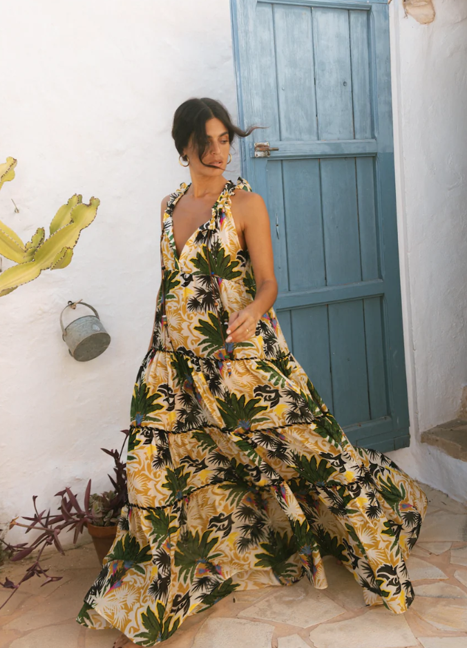 Long silk–cotton voile dress featuring a lace-up neckline adorned with delicate crochet embroidery. The sleeveless silhouette is exquisitely enhanced with precious stone embellishments and refined hand-finished detailing, elevating the piece with artisanal sophistication.